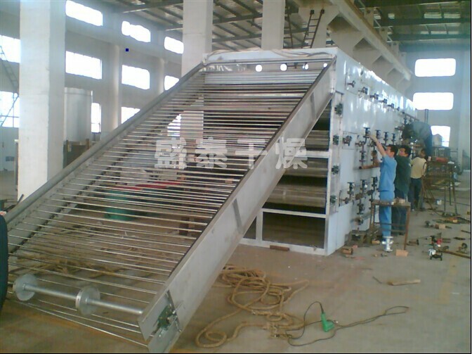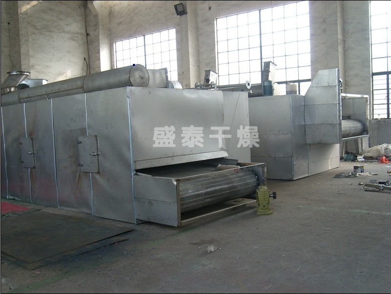 將需要處理的物料通過適當的布料機構,如星型布料機、擺動帶、粉碎機或造粒機,分布在輸送帶上,輸送帶通過一個或幾個加熱單元組成的通道,每個加熱單元均配有空氣加熱和循環系統,每一個通道有一個或幾個排濕系統,在輸送帶通過時,熱空氣從上往下或從下往上通過輸送帶上的物料,從而使物料能均勻干燥。